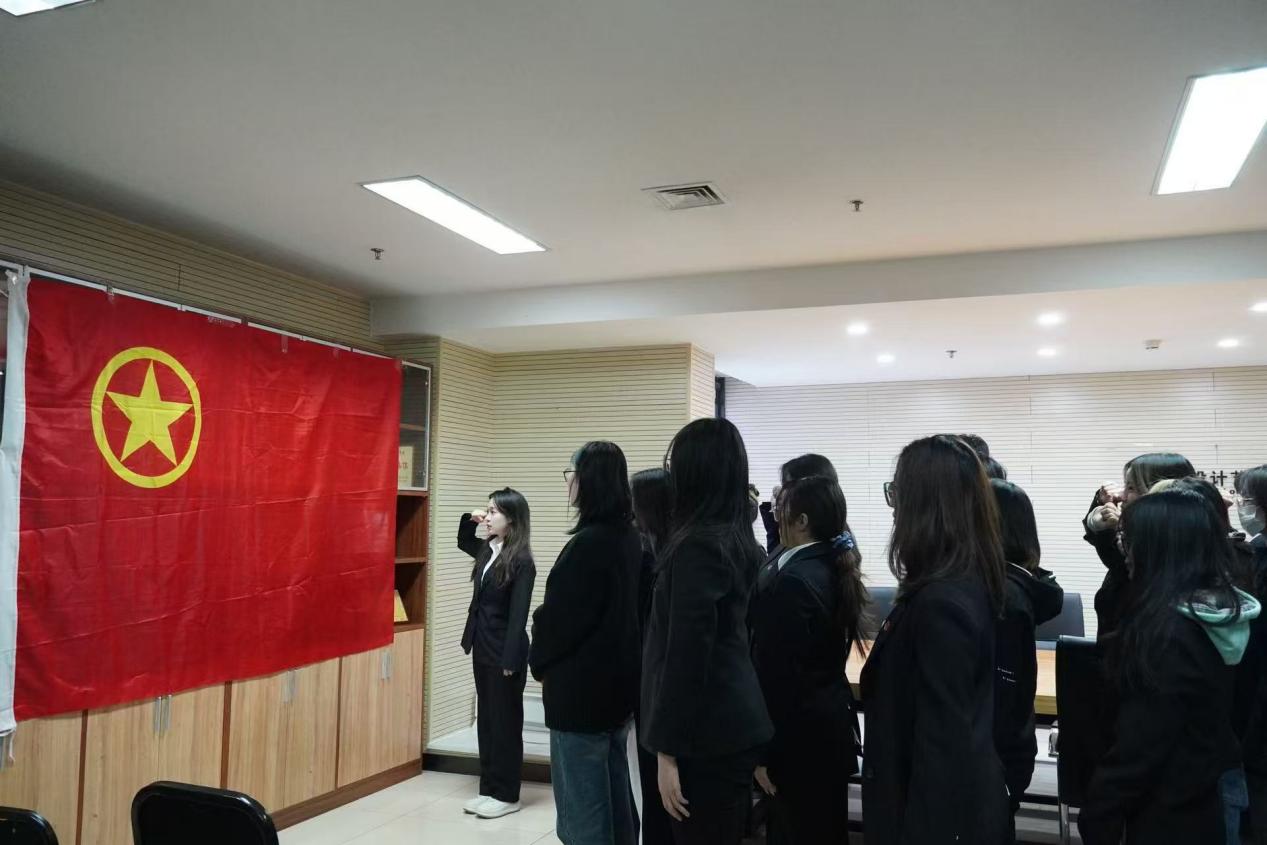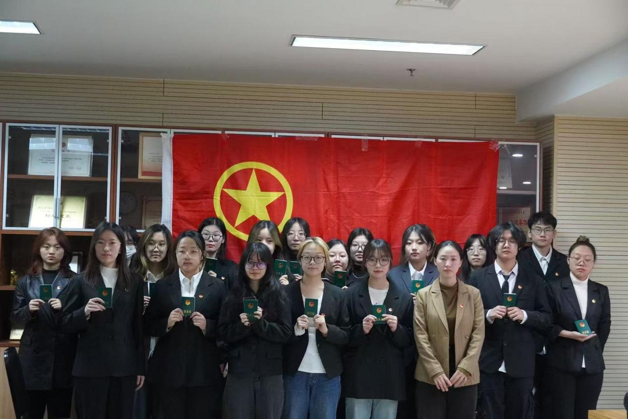 入团仪式在庄严的国歌声中拉开帷幕,刘罗娜扬宣读新发展团员名单,董琪琪为新团员们佩戴团徽并发放团员证,新发展团员面向团旗郑重宣誓。