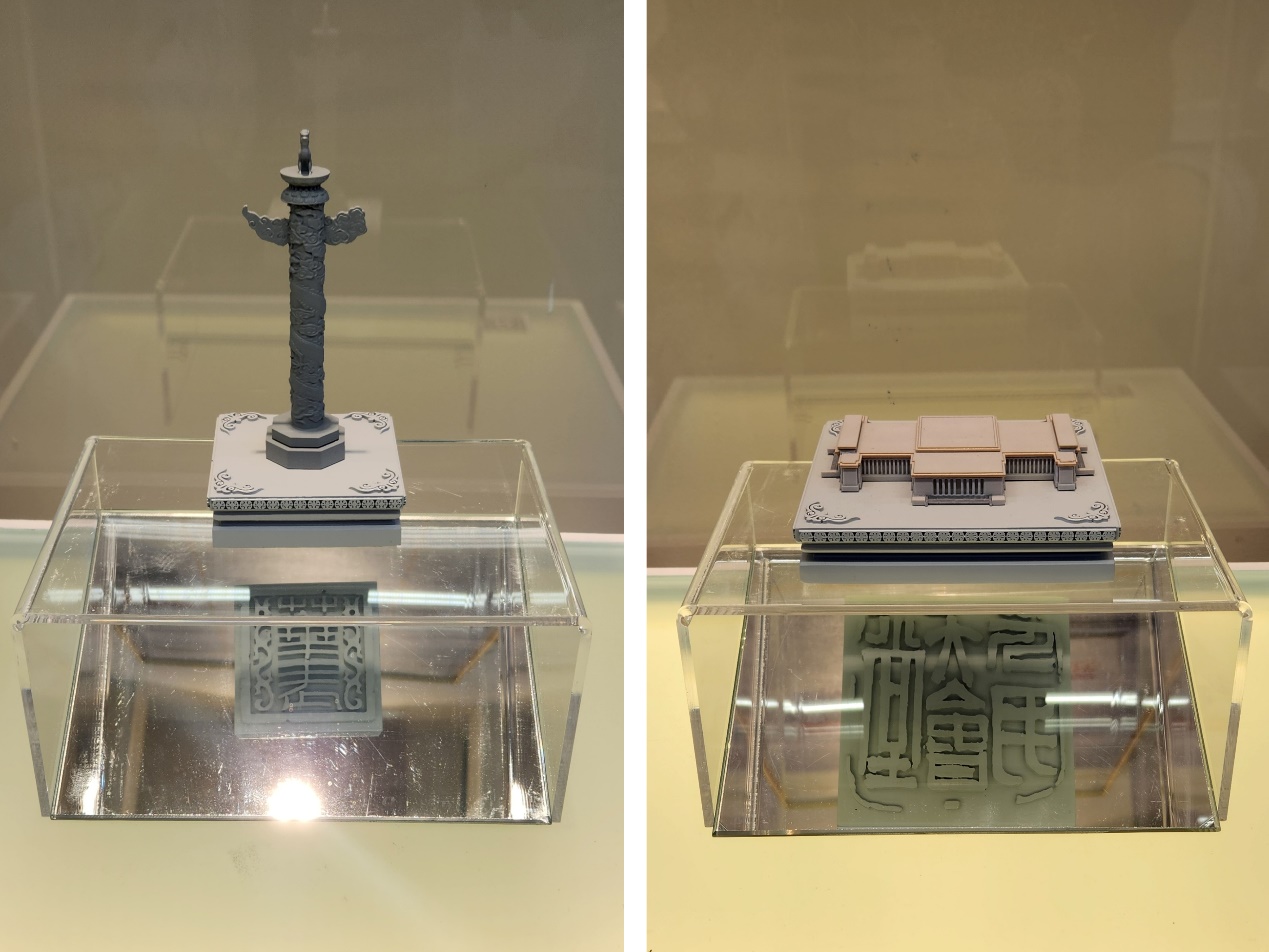 本次参展作品分为印面篆刻创作和印纽及印身设计制作两个部分,印纽及印身设计制作由杨莉、胡明辉、赵颖、杨默涵、牛明明、巫建等教师团队对中轴线上的代表性建筑进行高精度三维建模设计并完成3D打印制作,同时也为本次展览的虚拟展示部分搭建了建筑模型素材,印面篆刻创作由窦向亲、龙友、崔迎春、黄勤、孙浩等教师团队完成。
