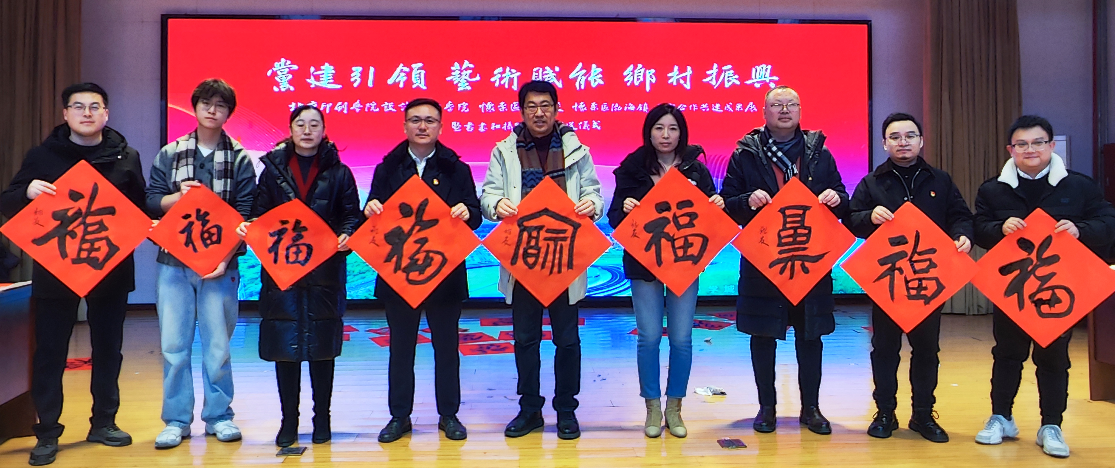 为推动党建与区域发展相融共促,充分发挥党建引领作用,切实提升乡村振兴发展质效,1月20日,设计艺术学院党委联合怀柔区委党校党委、渤海镇党委,在怀柔区渤海镇综合文化中心举行“党建引领 艺术赋能 乡村振兴”主题党日活动,向渤海镇老党员赠送画像和摄影作品,书写春联送“福”下乡。设计艺术学院部分教师、怀柔区委党校教职工及渤海镇党员干部参加联合主题党日活动,活动由怀柔区委党校副校长虎宽全主持。