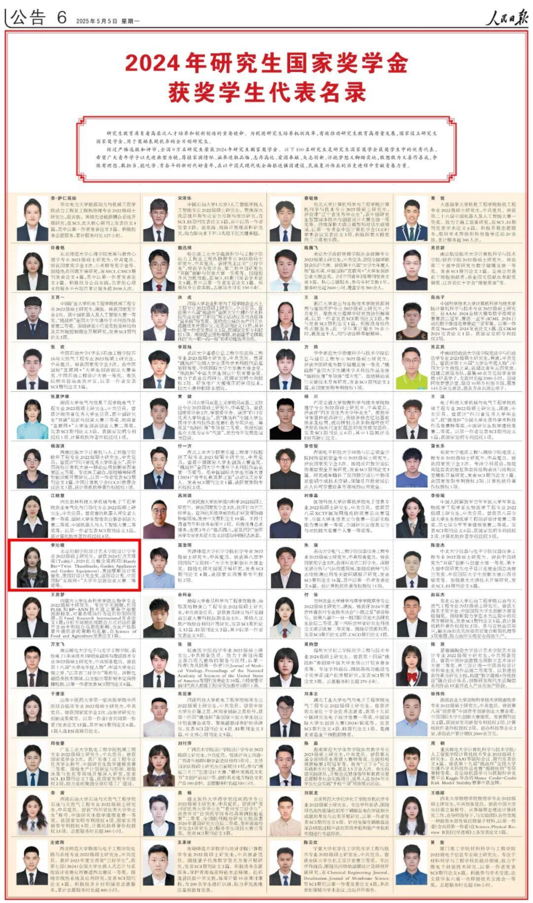近期,《人民日报》刊登了2024年国家奖学金获奖学生代表名录。全国9万名研究生荣获2024年研究生国家奖学金,设计艺术学院研究生李沁徽作为获奖学生中的优秀代表,荣登《人民日报》百人名单。